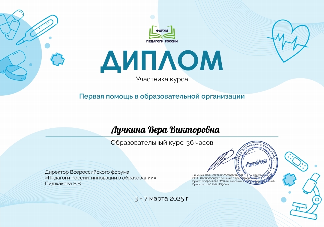 - Диплом участника курса «Первая помощь в образовательной организации», 2025г.