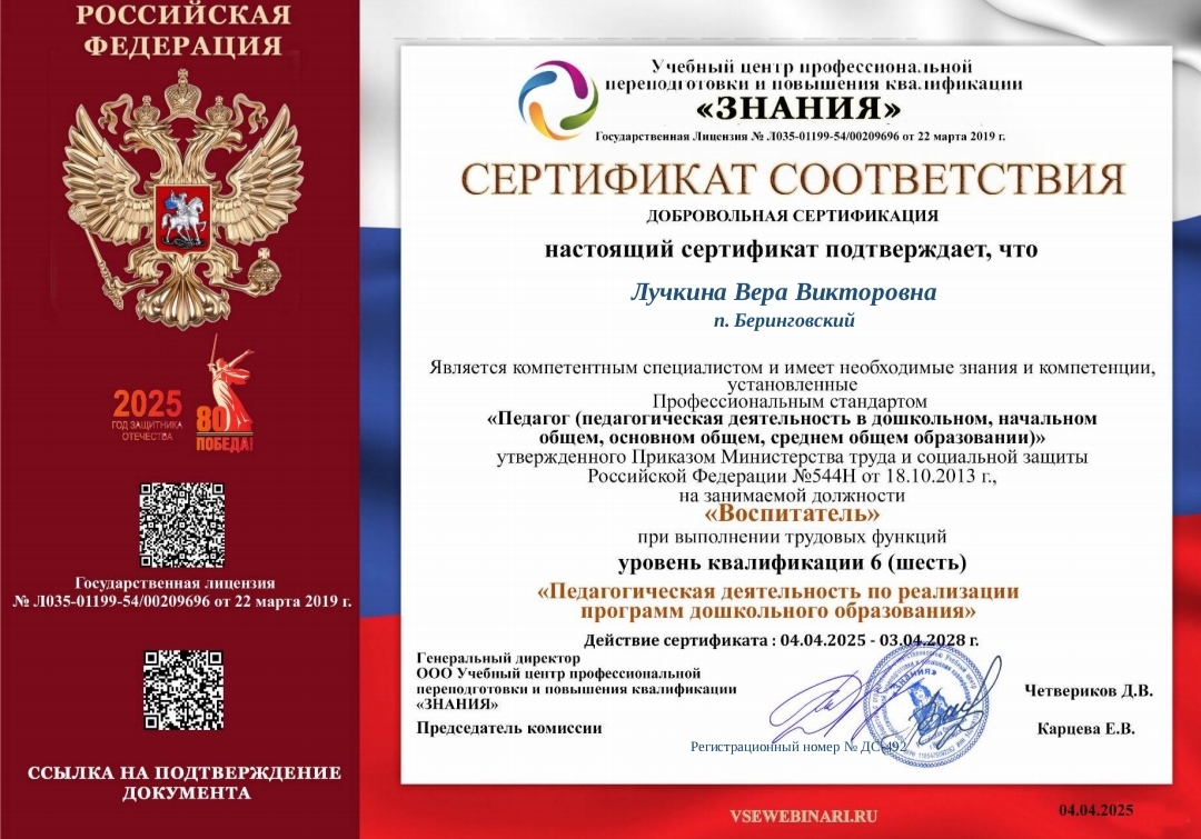 - ООО УЦ профессиональной переподготовки и повышения квалификации «Знание», по курсу «Современные методы дошкольной педагогики и технологии активного обучения в условиях ФГОС ДО», 2025г.