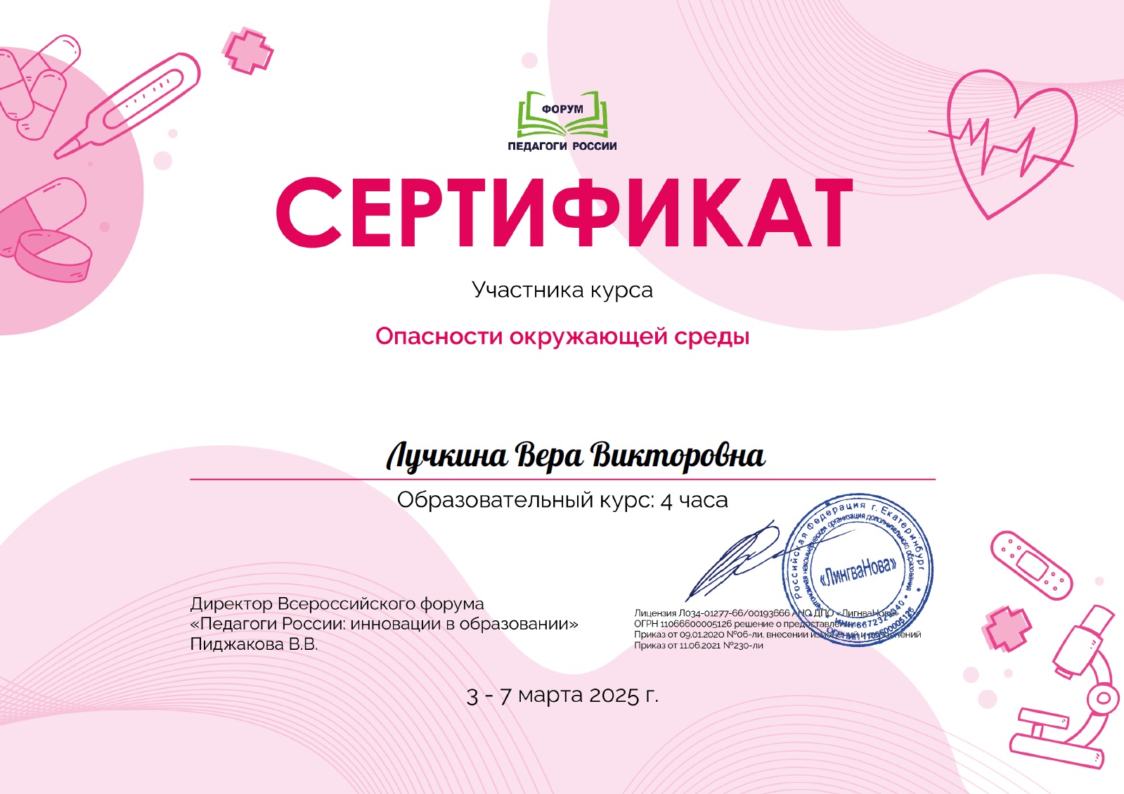 - Сертификат участника курса «Опасности окружающей среды», 2025г.